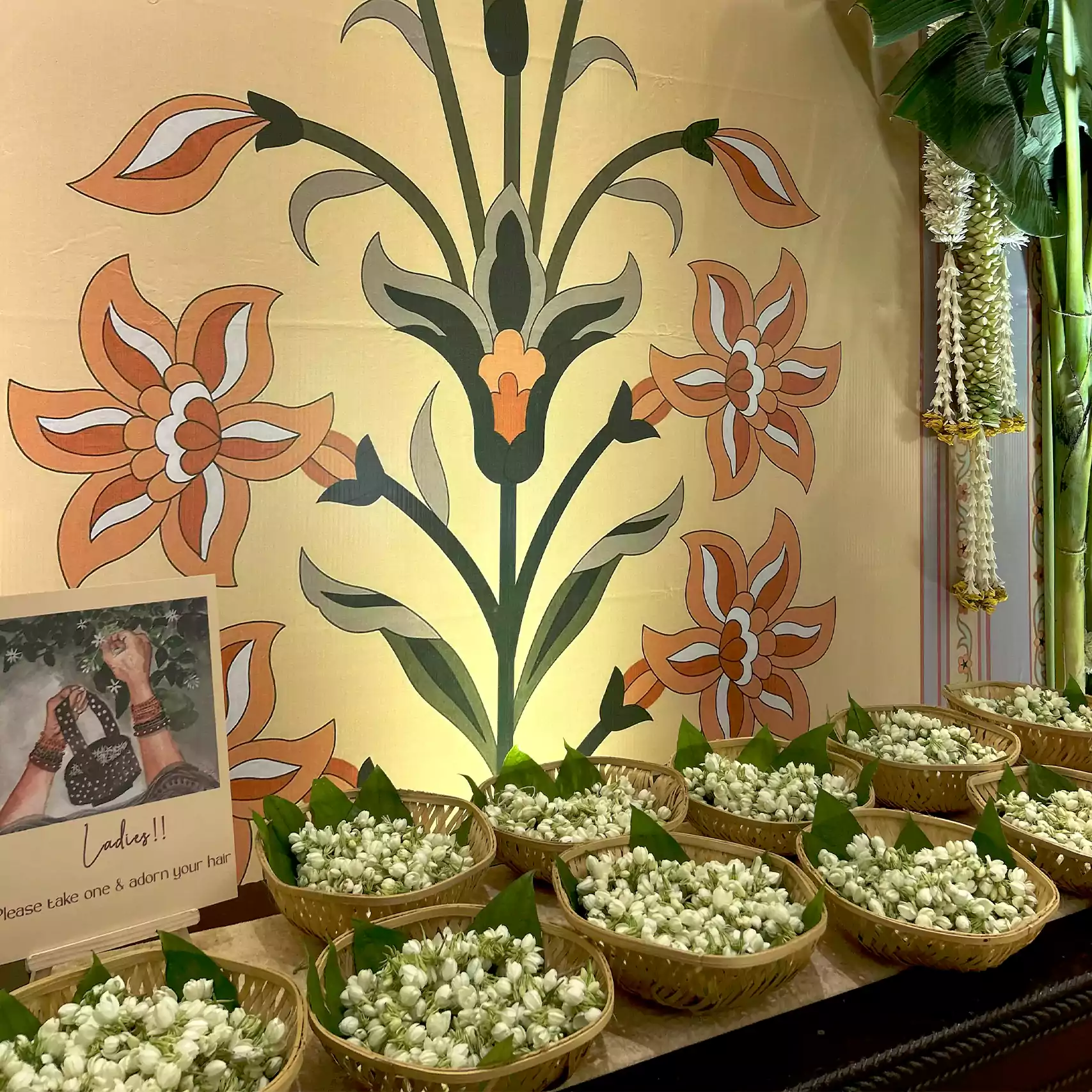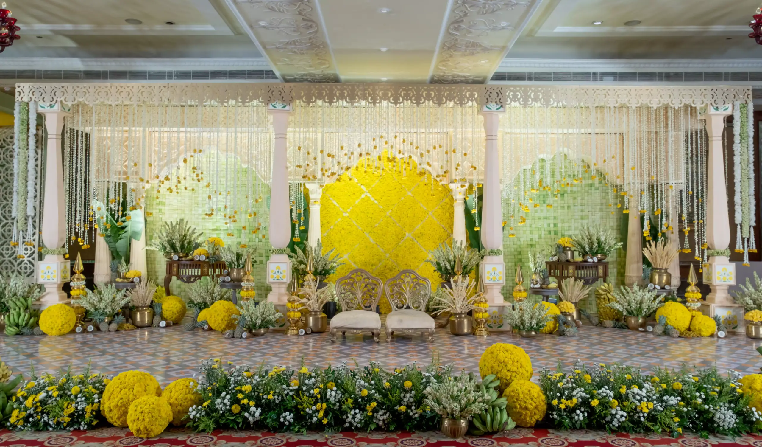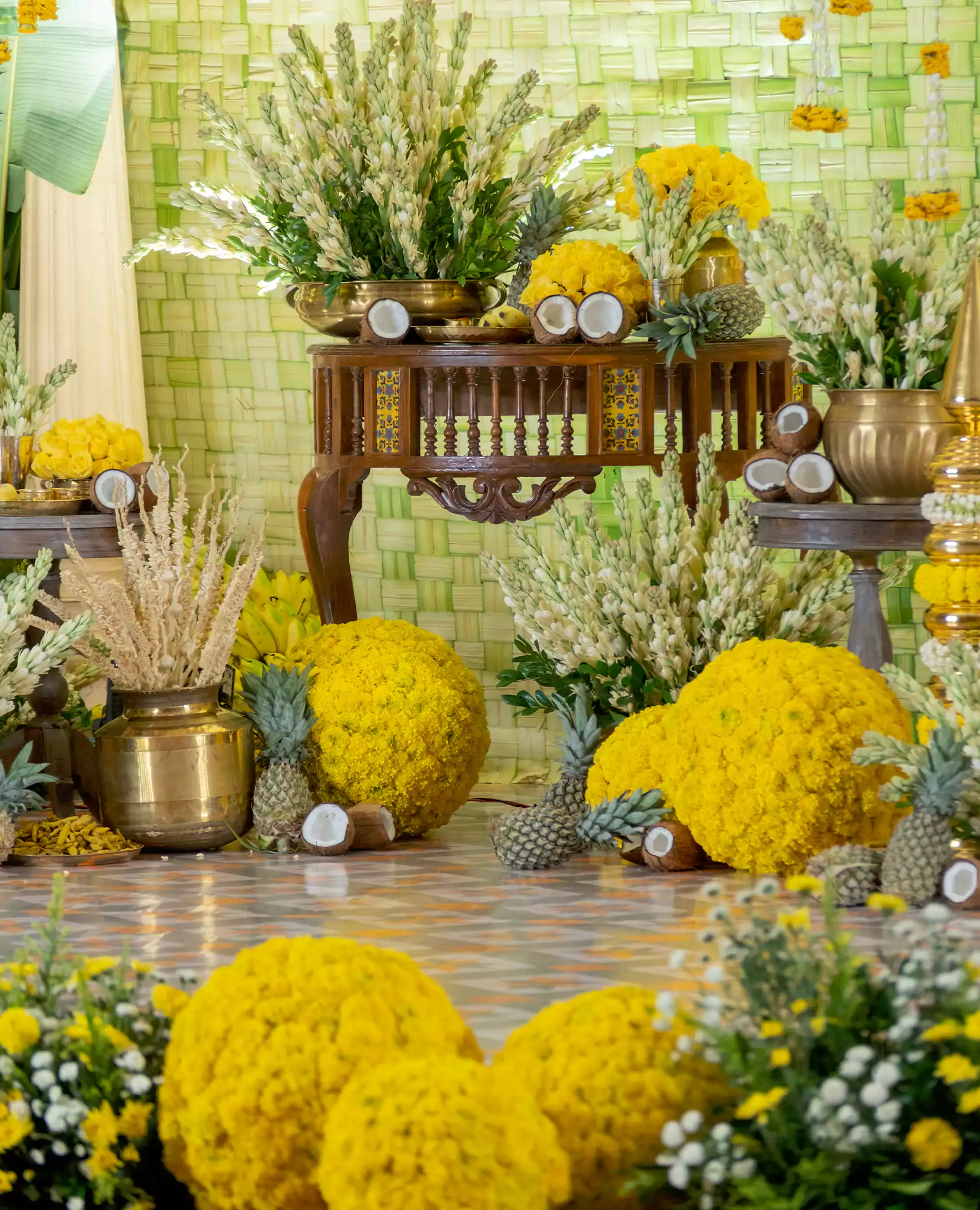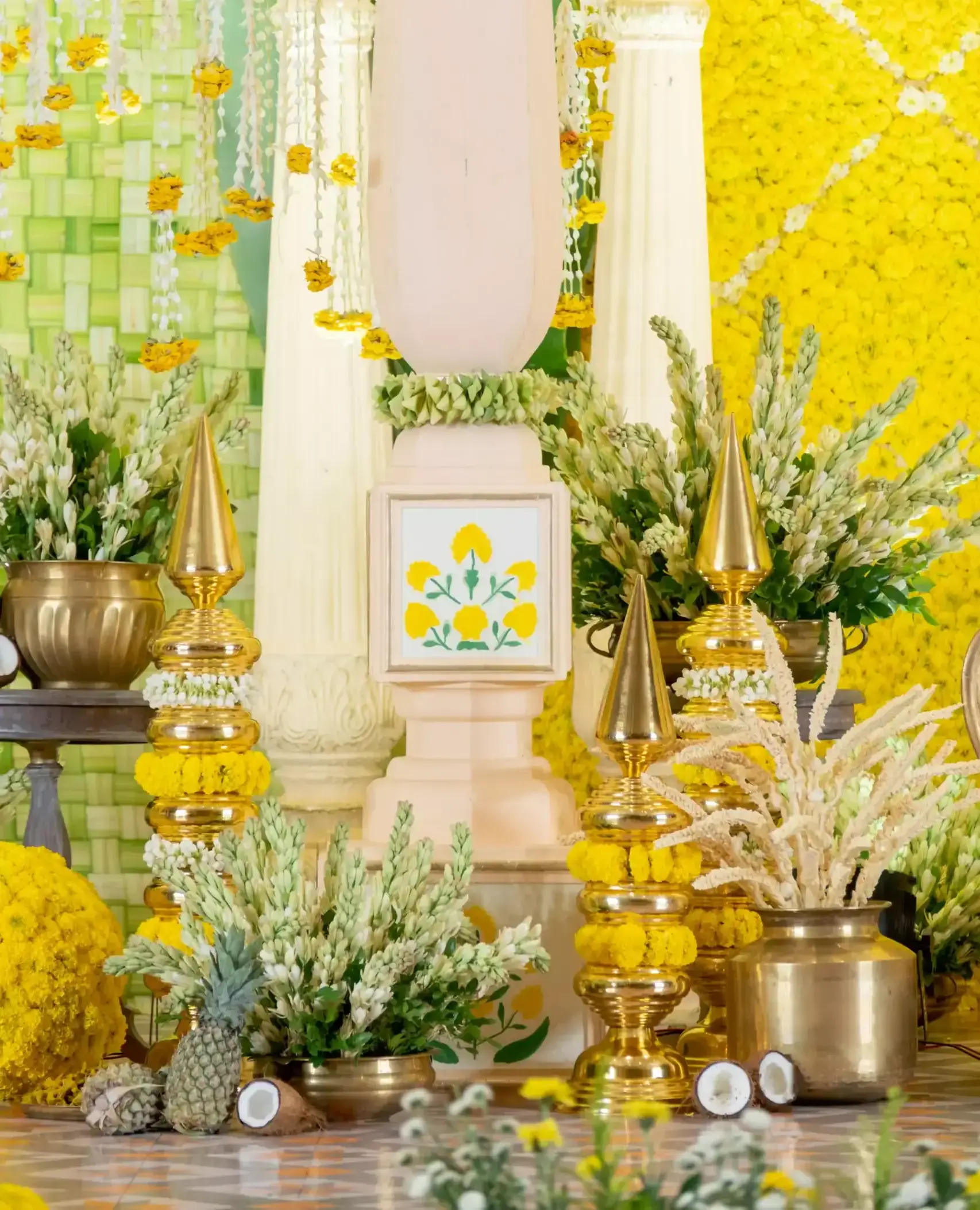 A soft yellow palette met timeless tradition in Aishwarya & Achyuth’s intimate engagement. With brass accents, coconuts, and floral hangings, the space echoed heritage; softened by pastels, steeped in soul.