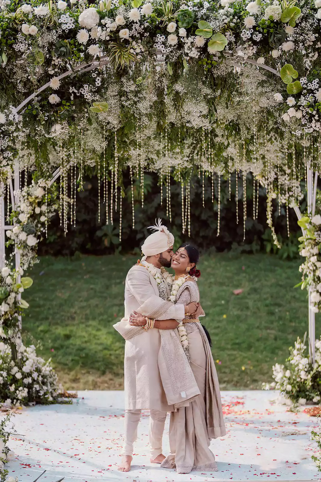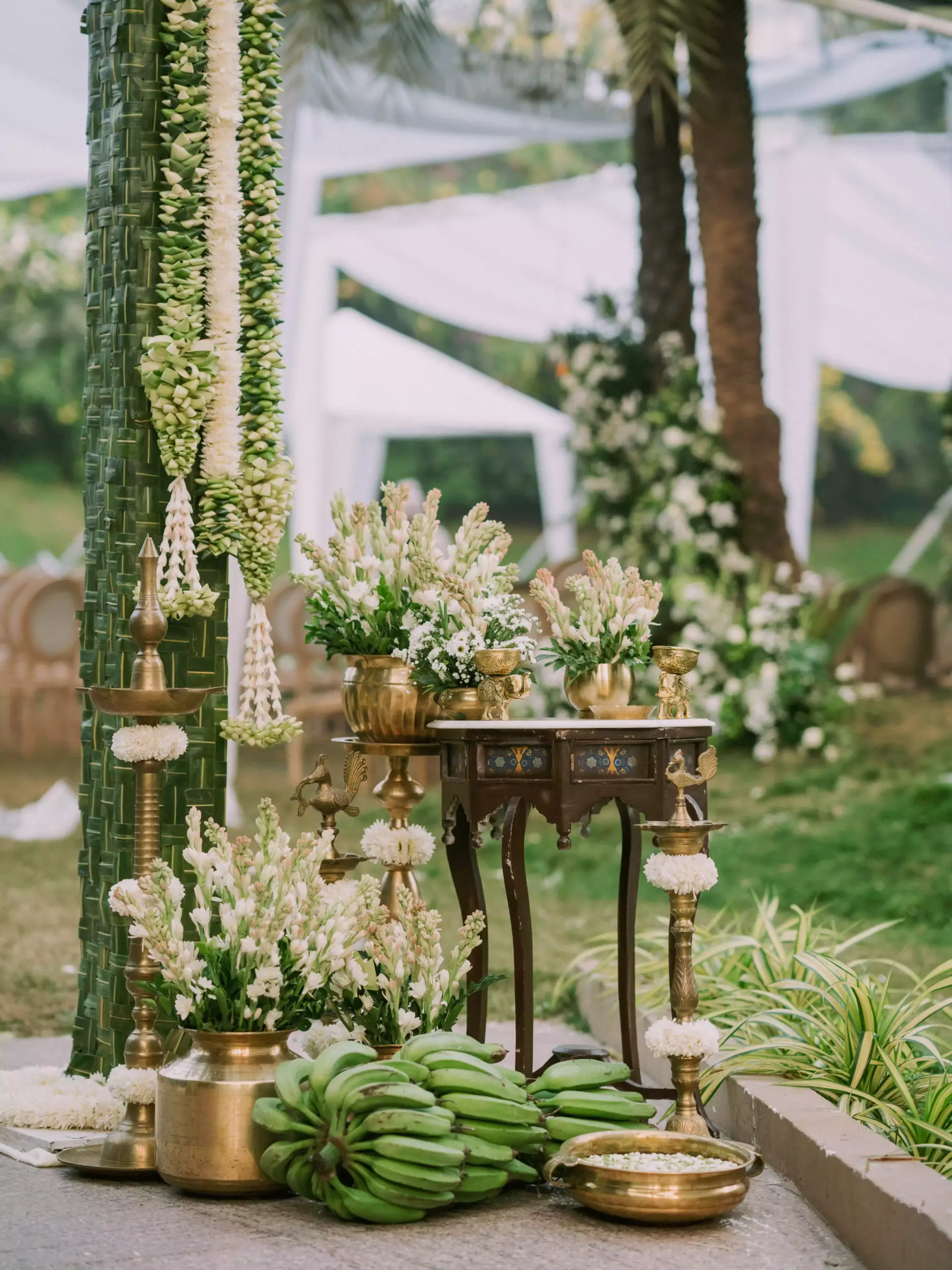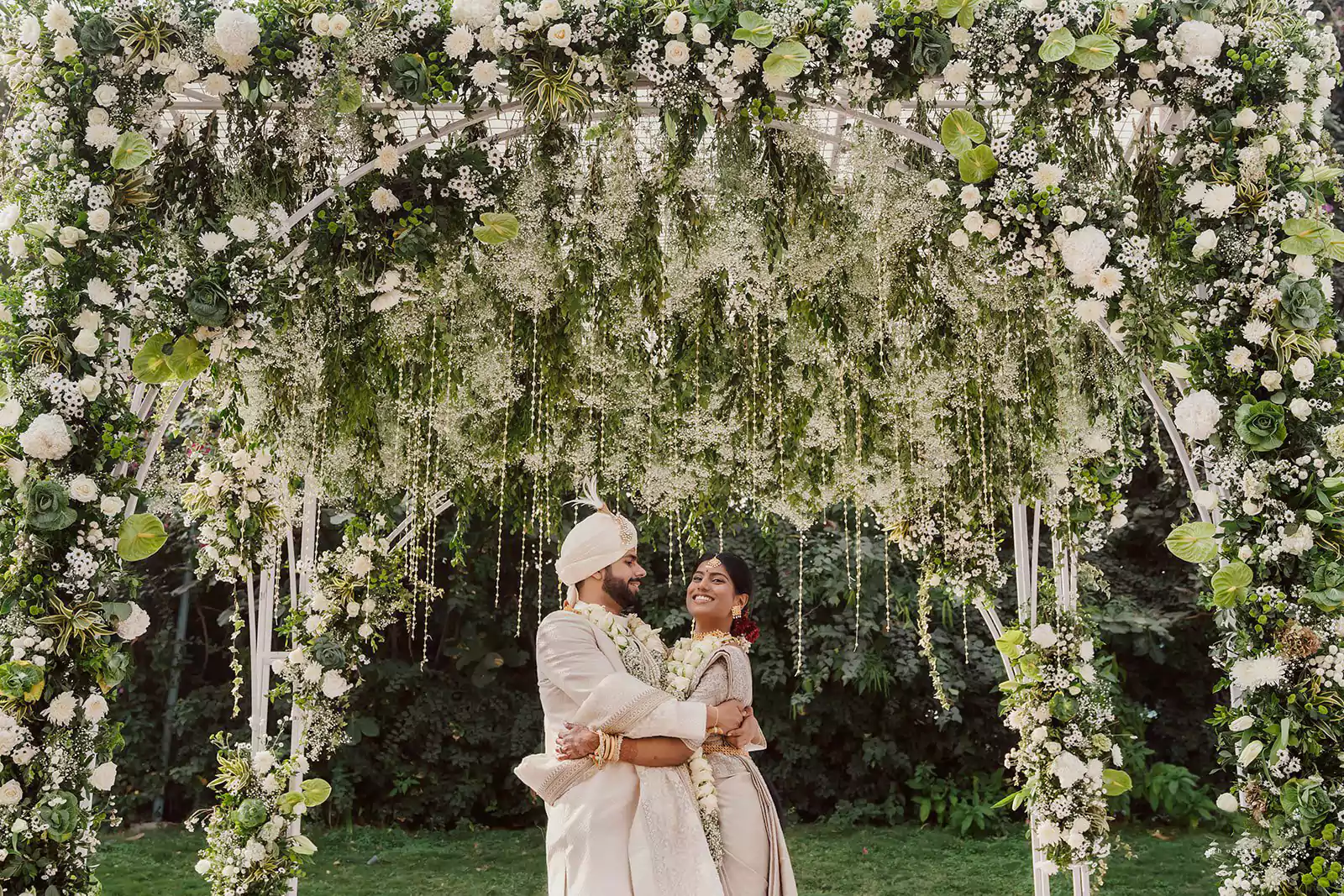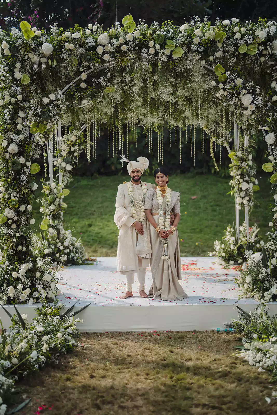 It’s the perfect two states wedding, that’s we love to call. Two states, united by love, telling one story. A seamless blend of North and South, Lalita & Sahil’s wedding brought cultures together beneath a contemporary mandap. Set outdoors, under a natural floral gazebo with brass accents, tradition met modern elegance in perfect harmony.
