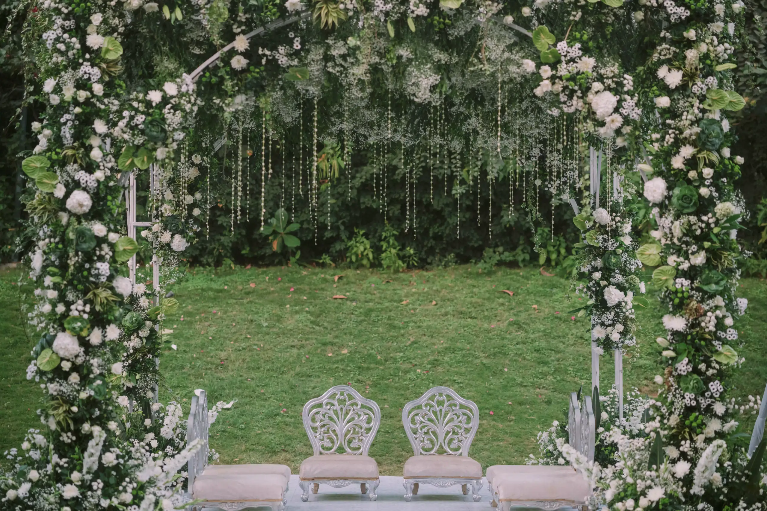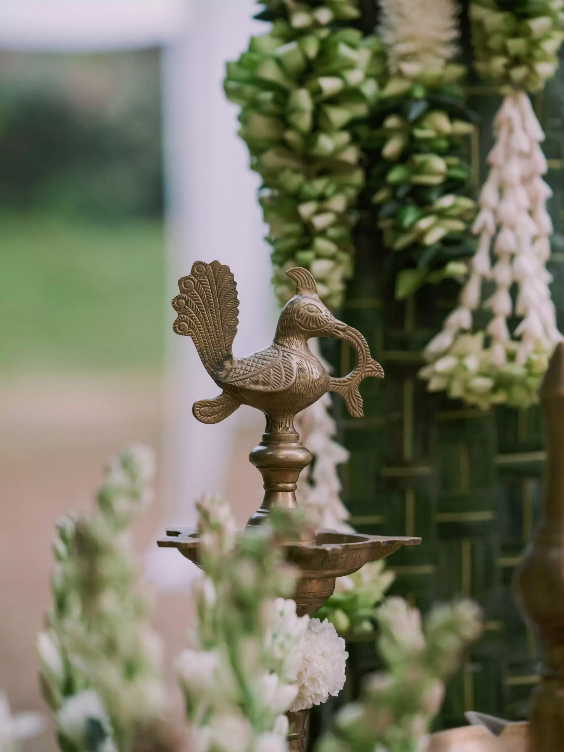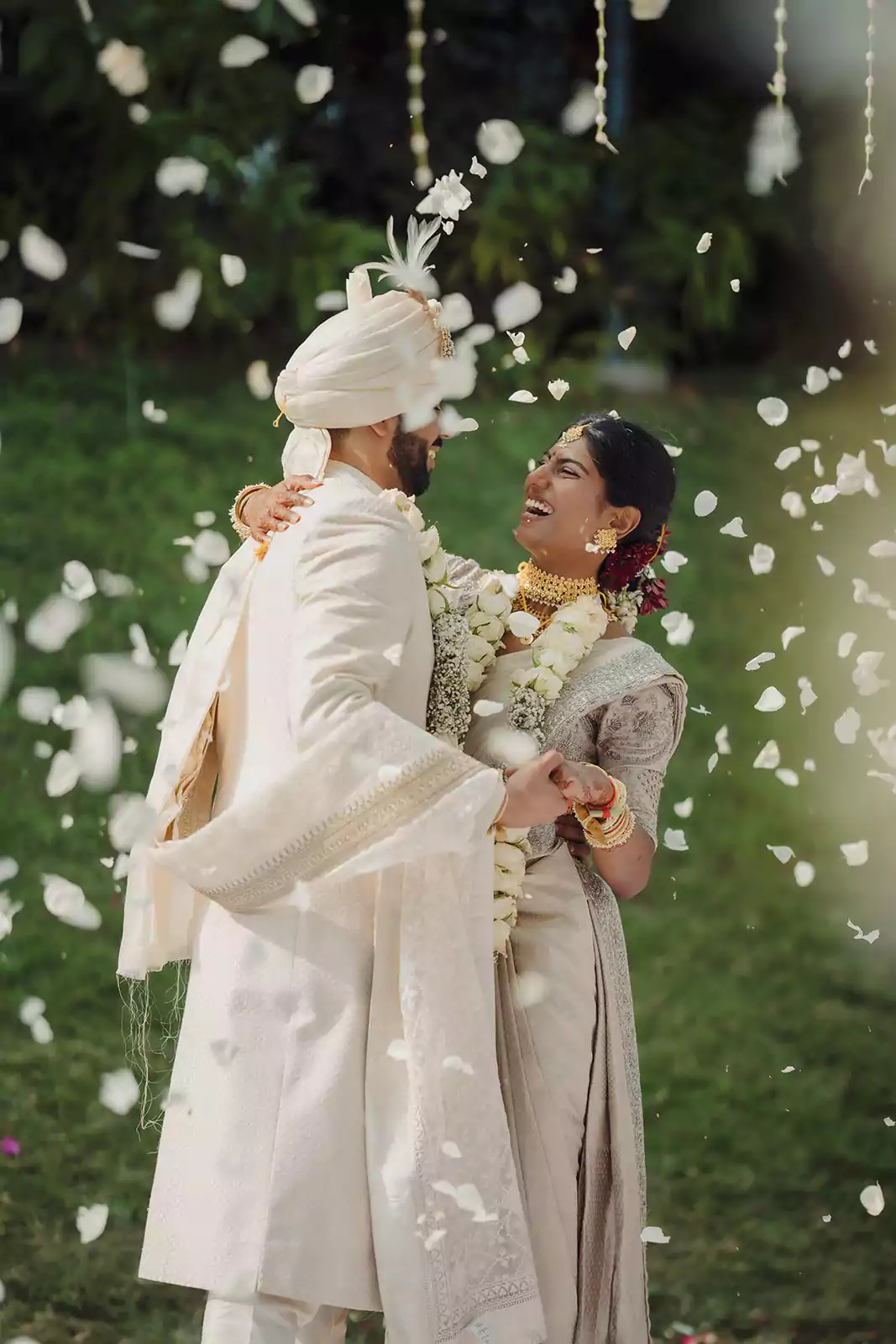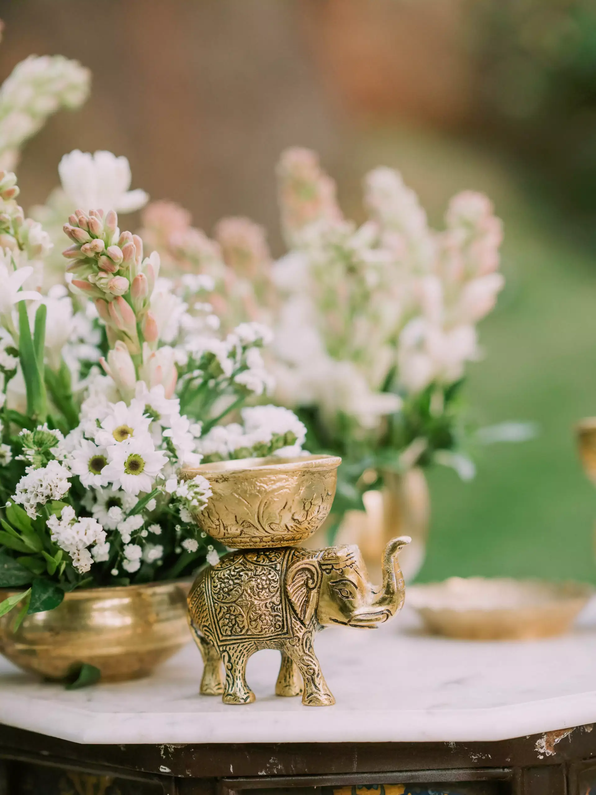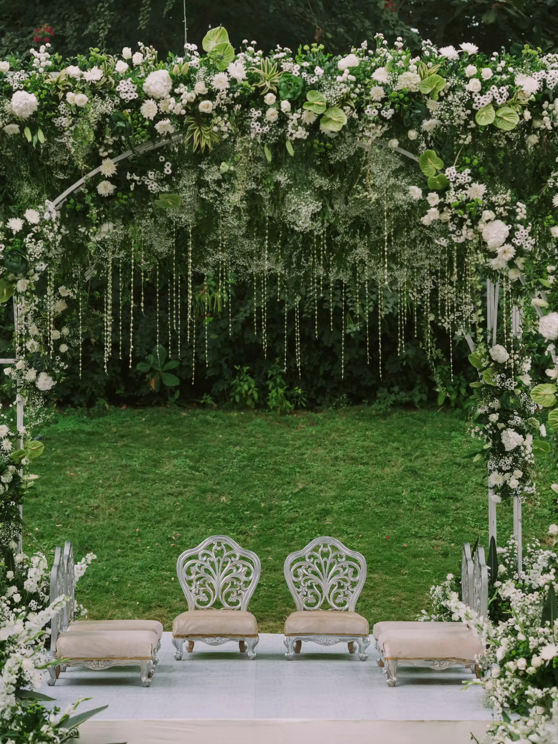 It’s the perfect two states wedding, that’s we love to call. Two states, united by love, telling one story. A seamless blend of North and South, Lalita & Sahil’s wedding brought cultures together beneath a contemporary mandap. Set outdoors, under a natural floral gazebo with brass accents, tradition met modern elegance in perfect harmony.