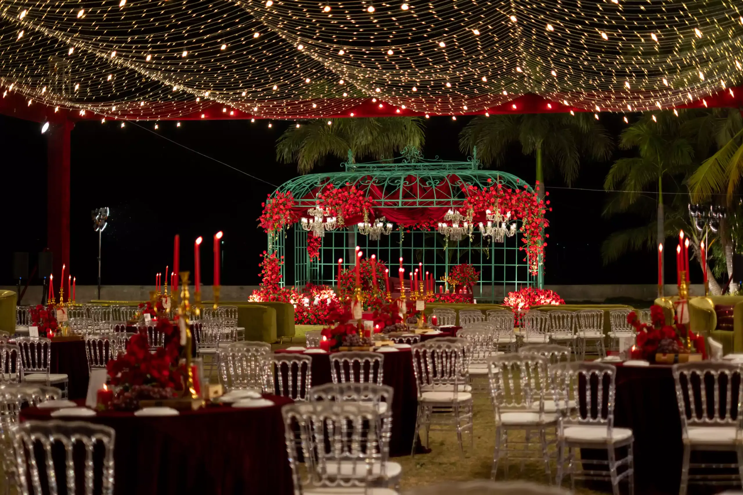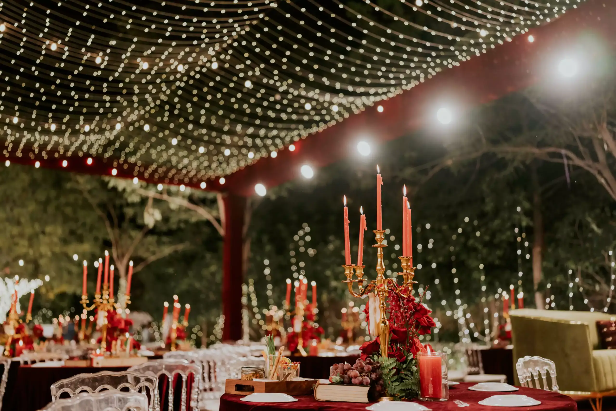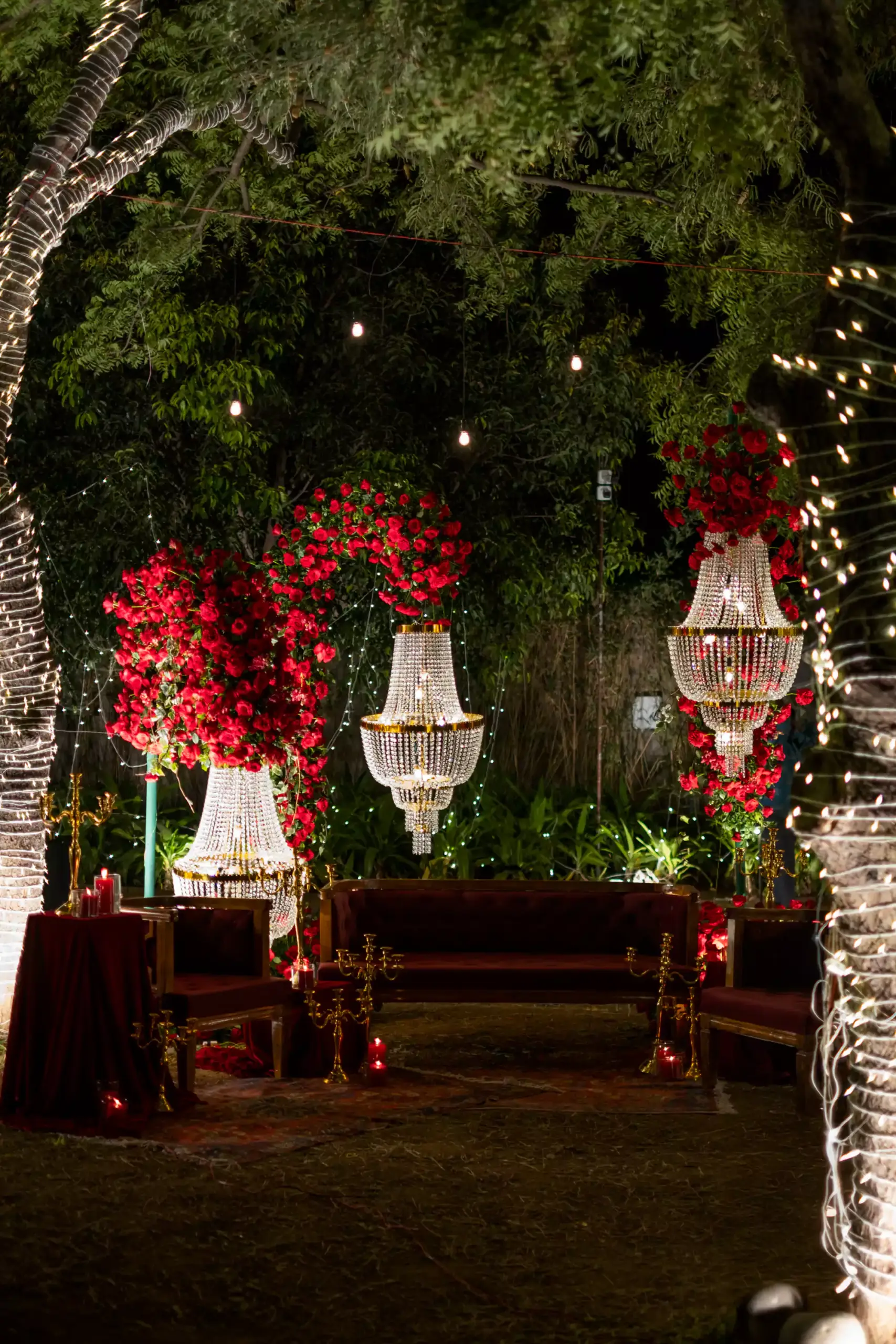 Inspired by the couple’s magical first meeting in London during Christmas, this reception recreated the warmth of that winter night with vintage elegance, deep reds, forest greens, twinkling lights, and an abundance of blooms. A romantic nod to their new beginnings, reimagined into a timeless celebration.